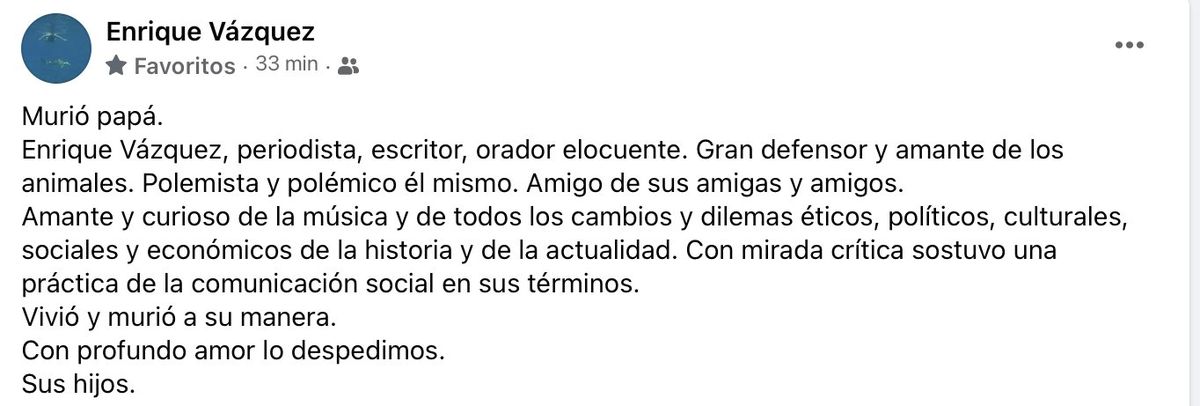 El periodista y escritor Enrique Vázquez, quien fue subdirector de Radio Nacional, docente universitario y se destacó en los tiempos de la revista "Humor", murió este martes a los 70 años, según confirmó su familia a través de las redes sociales.