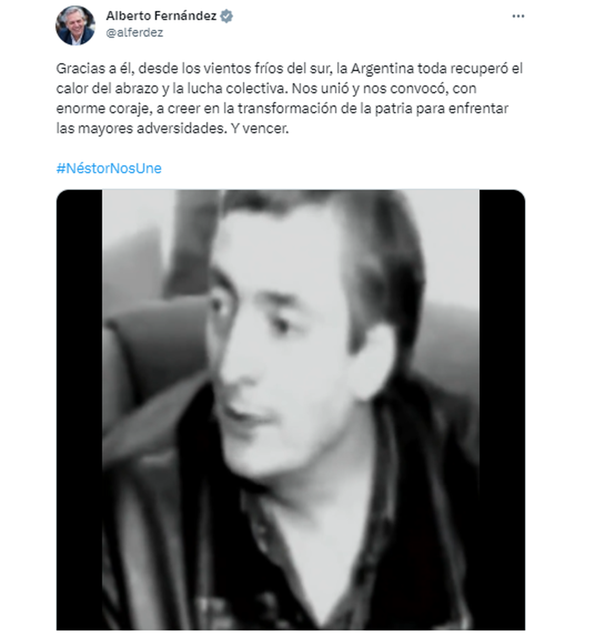 "Gracias a él, desde los vientos fríos del sur, la Argentina toda recuperó el calor del abrazo y la lucha colectiva. Nos unió y nos convocó, con enorme coraje, a creer en la transformación de la patria para enfrentar las mayores adversidades. Y vencer", dice el posteo que compartió Alberto Fernández junto a un video.