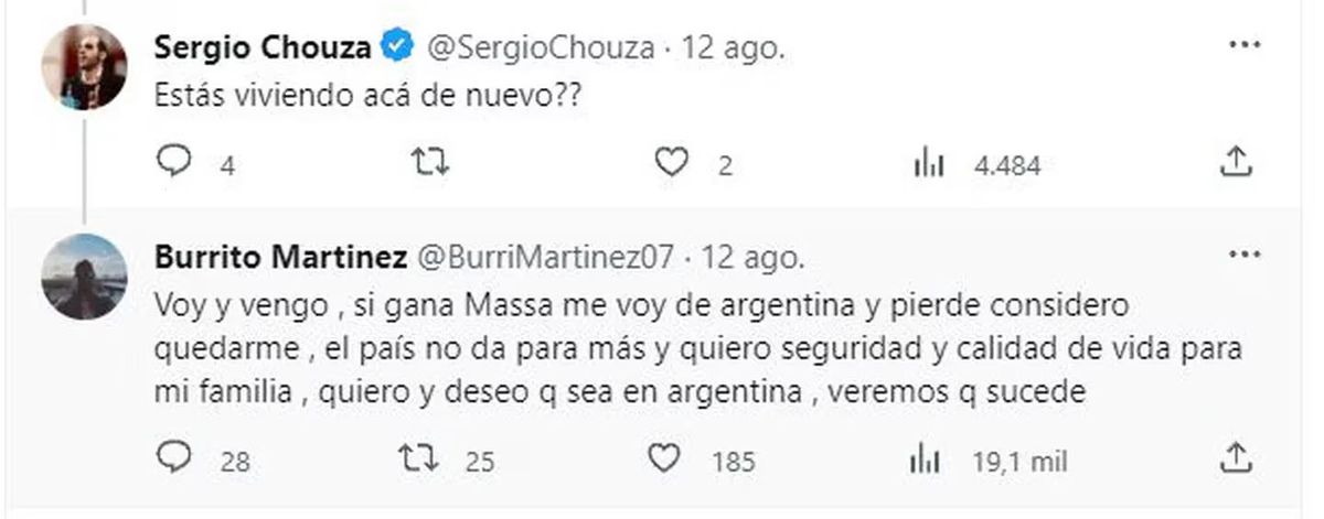 El "Burrito" compartió su perspectiva sobre la situación política y económica del país después de las elecciones. Con un comentario en un hilo de la plataforma Twitter, ahora conocida ahora como "X", respondió al economista y director de la consultora Sarandí, Sergio Chouza. "Voy y vengo. Si Massa gana, dejo Argentina. Si pierde, considero quedarme", expresó.