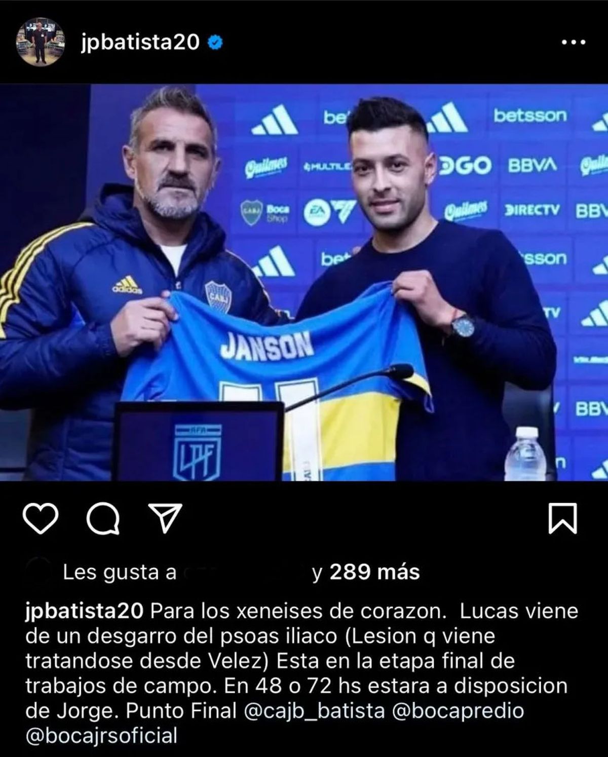 Jorge Pablo Batista, médico del equipo, rápidamente desmintió el rumor a través de un posteo en Instagram. Aclaró que Lucas Janson viene tratando un "desgarro del psoas iliaco" desde su tiempo en Vélez. Actualmente, se encuentra en la etapa final de recuperación y estará disponible para el entrenador Jorge Almirón en las próximas "48 o 72 horas".