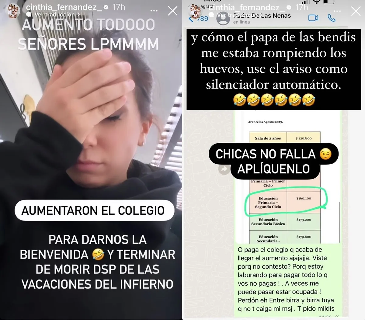 “Aumentó todo señores. Aumentaron el colegio. Para darnos la bienvenida y terminar de morir después de las vacaciones del infierno”, escribió indignada en su posteo. Al tiempo que en otra Storie detalló que desde agosto deberá abonar 160 mil pesos por cada nena, y reveló el reclamo que le hizo al exfutbolista.
