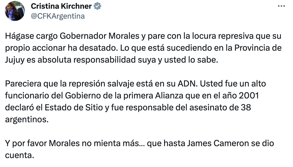 A través de su cuenta de Twitter, la vicepresidenta expresó: "Hágase cargo Gobernador Morales y pare con la locura represiva que su propio accionar ha desatado. Lo que está sucediendo en la Provincia de Jujuy es absoluta responsabilidad suya y usted lo sabe". Además, agregó que parece que la "represión salvaje" está en el ADN del gobernador.