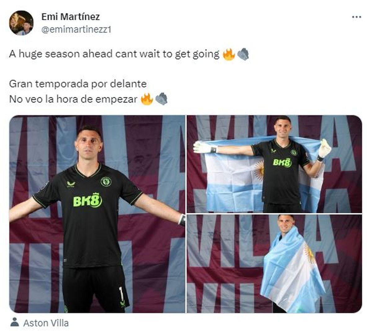“Gran temporada por delante. No veo la hora de empezar”, publicó el campeón del mundo en su cuenta de Twitter, acompañando sus palabras con imágenes del Media Day en las que posa junto a la bandera nacional. El primer partido de su equipo, Aston Villa, en el torneo inglés está programado para el próximo sábado contra el Newcastle a las 13:30.