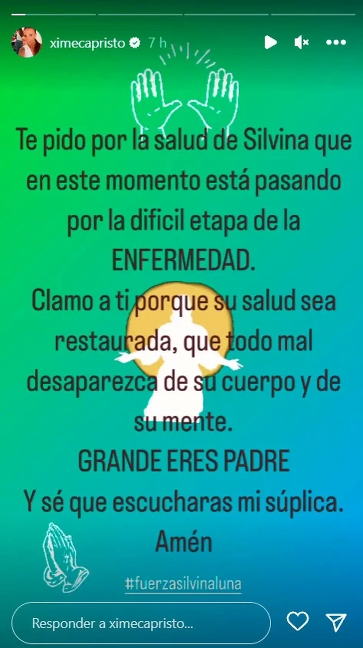 "Te pido por la salud de Silvina que en este momento está pasando por la difícil estapa de la enfermedad. Clamo por ti porque su salud sea restaurada, que todo mal desaparezca de su cuerpo y de su mente. Grande eres Padre y sé que escucharás mi súplica. Amén", sostuvo Capristo en su perfil de Instagram.