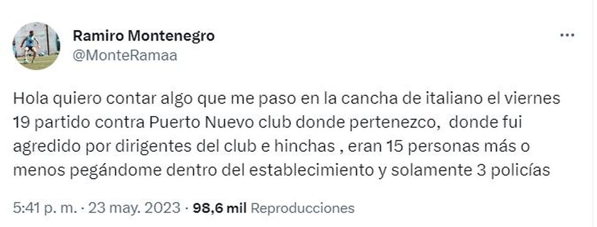 A través de sus redes sociales, el defensor de 34 años relató que fue golpeado por "dirigentes e hinchas. Eran alrededor de 15 personas golpeándome dentro del establecimiento y solo había 3 policías", denunció. Montenegro, quien previamente ha jugado para Barracas Central, Excursionistas, Luján y Defensores Unidos de Zárate, entre otros clubes, también reveló que fue llevado "en calidad de detenido a la Comisaría tercera" de Ciudad Evita. "Me cubrían, llevándome hacia la colectora, donde temí por mi vida porque no me subían a la patrulla para protegerme y seguían recibiendo golpes de todos lados, sin mencionar las amenazas con armas de fuego, hasta que llegó una patrulla de otra comisaría", relató Montenegro.