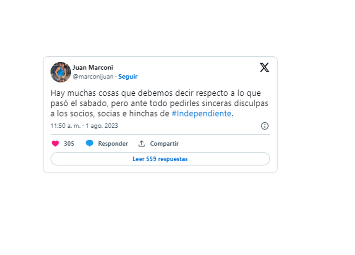 En su cuenta de Twitter, Marconi expresó: "Hay muchas cosas que debemos decir respecto a lo que pasó el sábado, pero ante todo pedirles sinceras disculpas a los socios, socias e hinchas de Independiente". El dirigente también fue señalado por los simpatizantes después de la derrota ante el equipo de Jorge Almirón por 2 a 0.