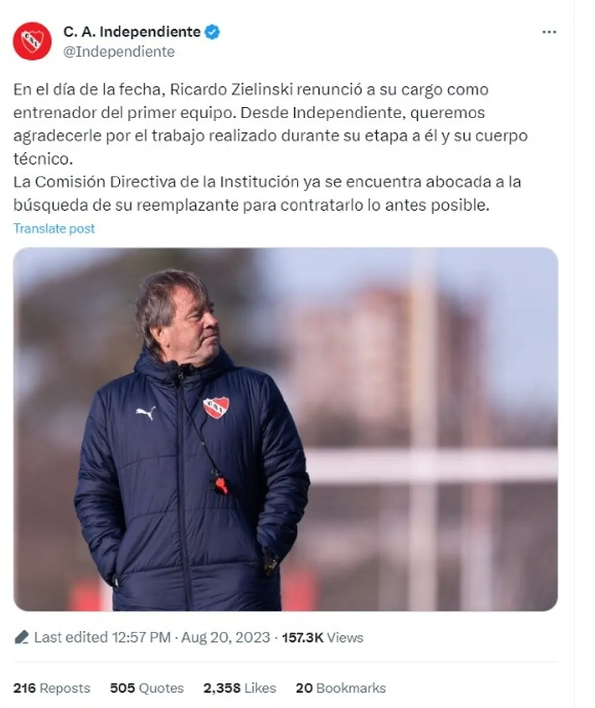 "En el día de la fecha, Ricardo Zielinski renunció a su cargo como entrenador del primer equipo. Desde Independiente queremos agradecerle por el trabajo realizado durante su etapa a él y su cuerpo técnico", anunció el club en sus redes sociales oficiales, agregando que la institución "ya se encuentra abocada a la búsqueda de su reemplazante".
