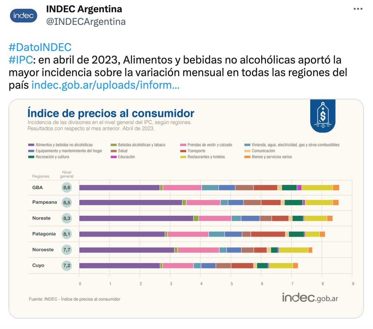 La inflación de abril fue del 8,4% y acumuló un aumento del 32% en el primer cuatrimestre de 2023, de acuerdo con el informe difundido este viernes por el INDEC. De esta manera, la inflación interanual (de marzo a marzo) ascendió a 108,8%.