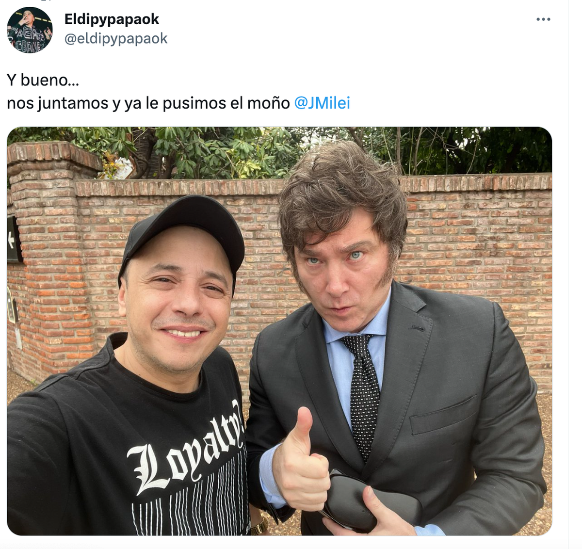 Por su parte, el Dipy aseguró: "Voy a apoyar a Javier porque es el único que plantea una solución para los argentinos. Venimos de décadas de fracasos, donde lo único que cambia es el chef pero la receta es la misma", y agregó: "Es el momento de trabajar para que algo nuevo, por fuera de la política, maneje este país y tengamos una salida real".
