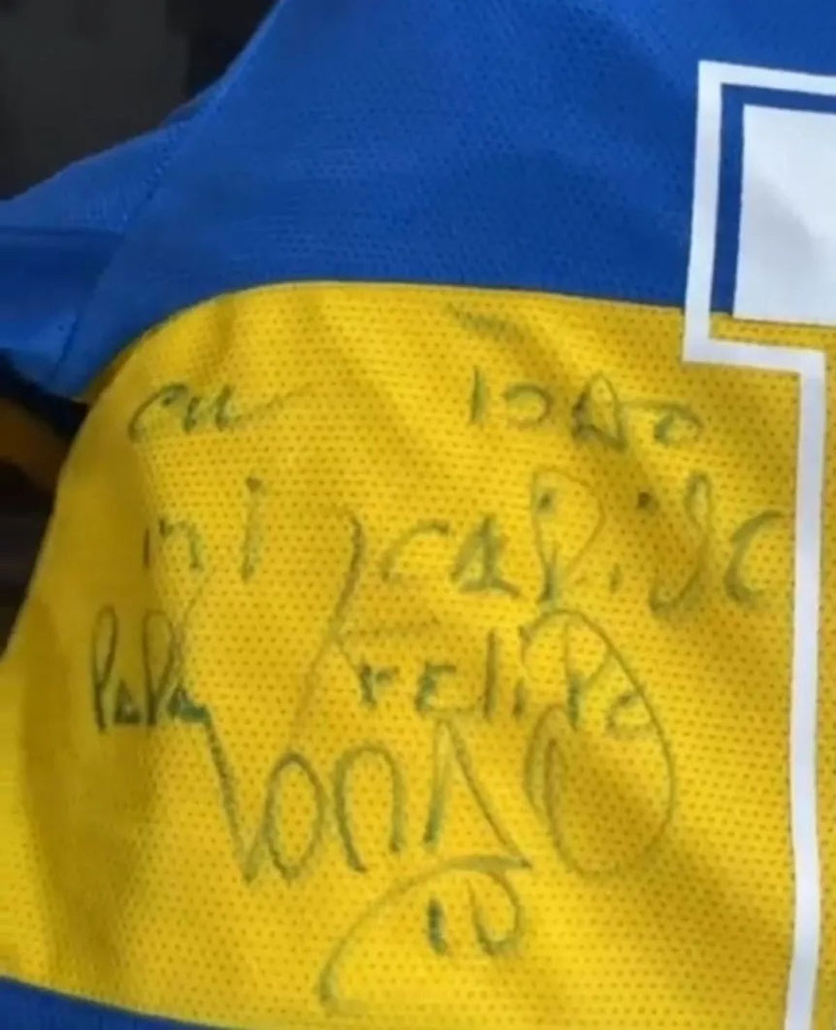 Posteriormente, Felipe Melo mostró la camiseta que Riquelme le obsequió como recuerdo de su breve paso por Casa Amarilla. En la camiseta, Román escribió un mensaje afectuoso: "Con todo mi cariño. Para Felipe Melo".