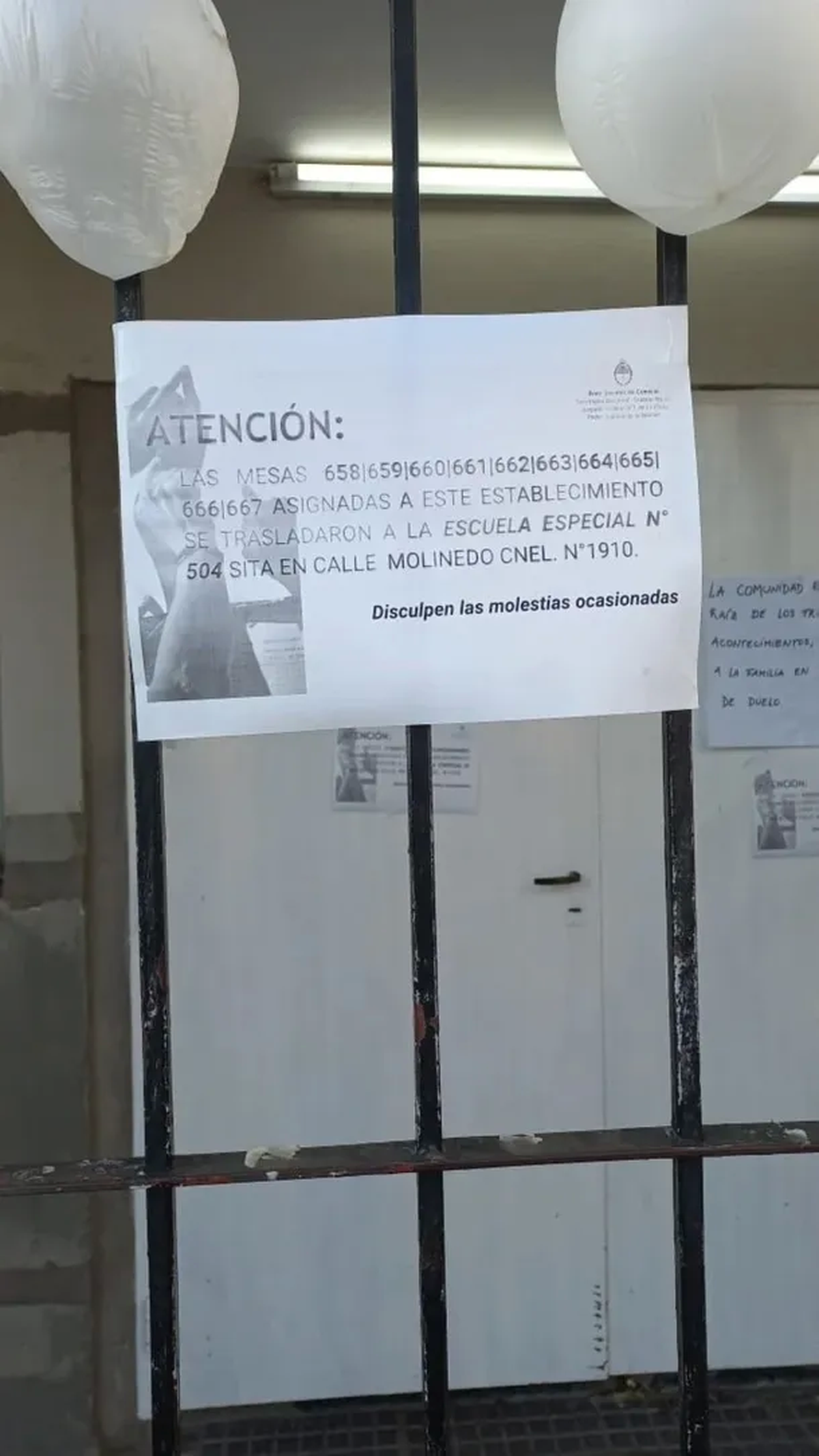 "Las mesas 658/659/660/661/662/663/664/665/666 y 667 asignadas a este establecimiento se trasladaron a la escuela especial N° 504, sita en la calle Coronel Molinedo 1910. Disculpen las molestias ocasionadas", señalaba el cartel que pusieron en la puerta de la escuela N°60 Almafuerte de Villa Diamante, dónde sucedió el crimen de la niña de 11 años.