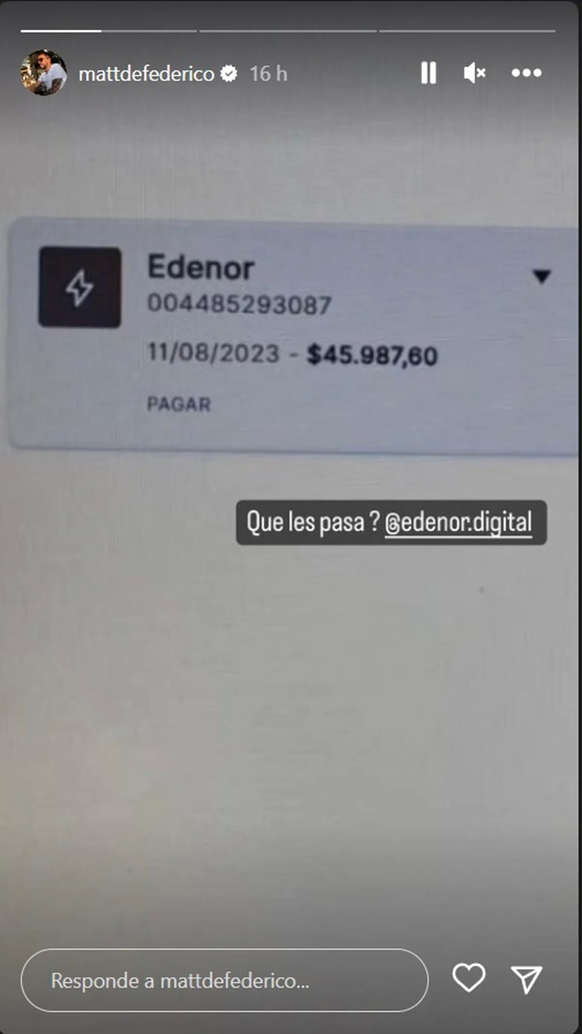 En las últimas horas, el ex futbolista utilizó su cuenta de Instagram para mostrar su enojo con el monto de la última tarifa de luz que debía pagar, la cual ascendía a casi 46 mil pesos. Defederico mencionó directamente a la empresa proveedora del servicio en cuestión y expresó su frustración ante el elevado importe.