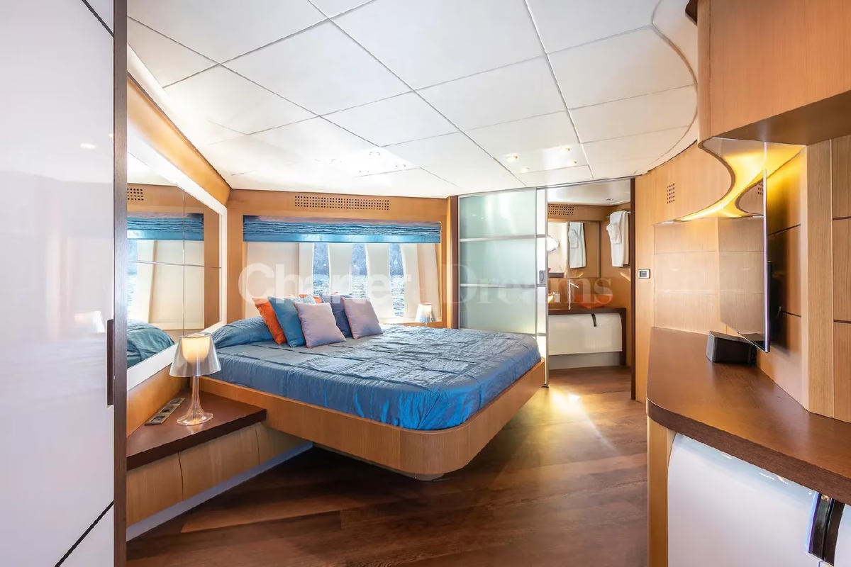 El yate se llama "Inspiration" y tiene una longitud de 27 metros, con capacidad para 8 personas distribuidas en 4 camarotes dobles. Cuenta con un amplio camarote principal, un camarote VIP y dos camarotes con camas separadas, todos ellos con baño propio.