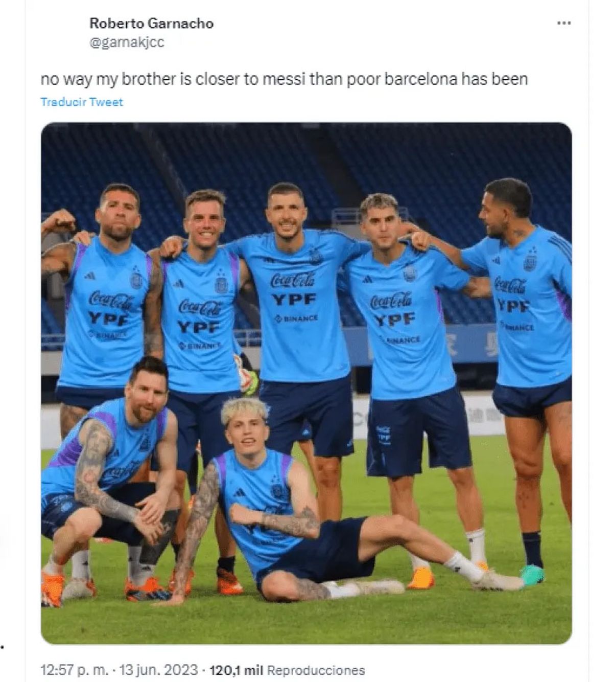 Durante un entrenamiento previo al partido, se realizó una foto del equipo, en la que Messi y Garnacho aparecen juntos. El hermano del futbolista del Manchester United, aprovechó esta ocasión para lanzar un comentario provocador contra el Barcelona, equipo con el que Alejandro ha tenido algunos enfrentamientos en el pasado.