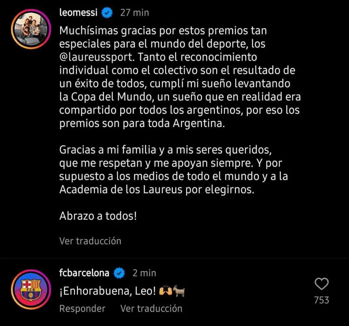 "Muchísimas gracias por estos premios tan especiales para el mundo del deporte", fue lo primero que escribió la Pulga en su cuenta de Instagram. Además, afirmó que "tanto el reconocimiento individual como el colectivo son el resultado de un éxito de todos" y añadió: "Cumplí mi sueño levantando la Copa del Mundo, un sueño que en realidad era compartido por todos los argentinos, por eso los premios son para toda Argentina".