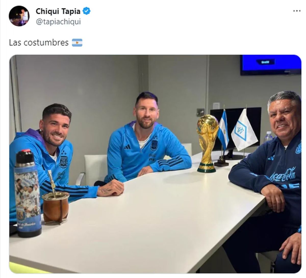 Antes de cada encuentro, Claudio "Chiqui" Tapia, el presidente de la AFA, acostumbra a realizar una publicación en las redes sociales que ya se ha convertido en una especie de superstición. En esta ocasión, compartió una foto de sí mismo tomando mate junto al capitán y el "Motorcito" de la Albiceleste. Lo novedoso en esta ocasión fue la presencia de la Copa del Mundo en la imagen.