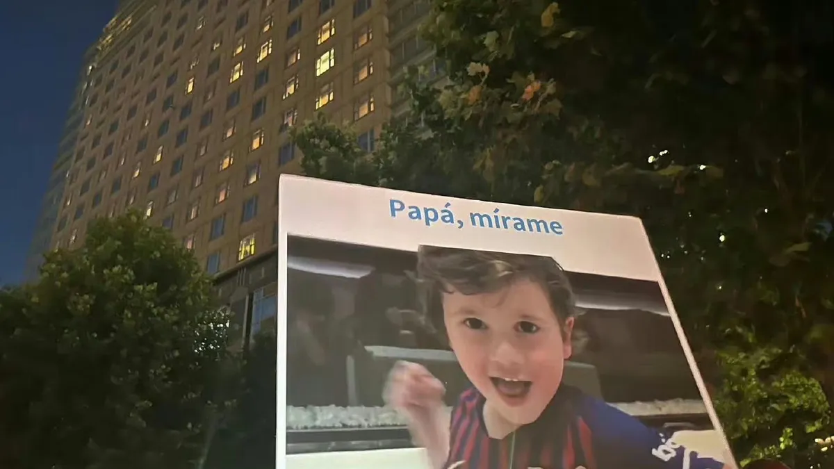 En Twitter se hizo viral la ingeniosa ocurrencia de un fanático durante una de las salidas del equipo hacia el entrenamiento: llevó un cartel con una foto de Mateo Messi, el hijo del medio del capitán argentino, junto a la frase "Papá, mirame".
