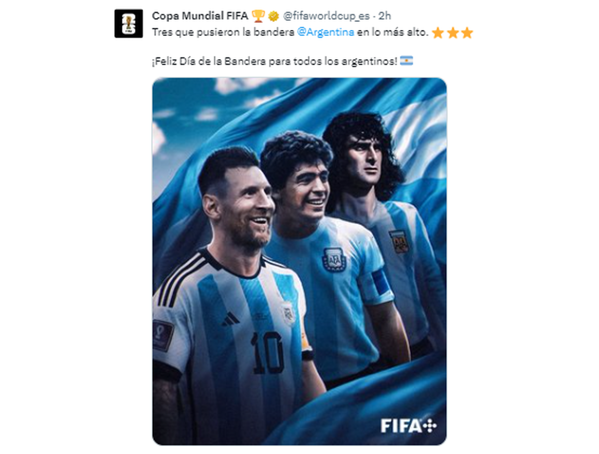 La FIFA aprovechó el Día de la Bandera para sintetizar en una foto con tres "próceres" el saludo por el aniversario de la muerte de Manuel Belgrano. Con un guiño futbolero, la imagen está compuesta por tres de los referentes de los tres campeonatos del Mundo conseguidos por la selección.