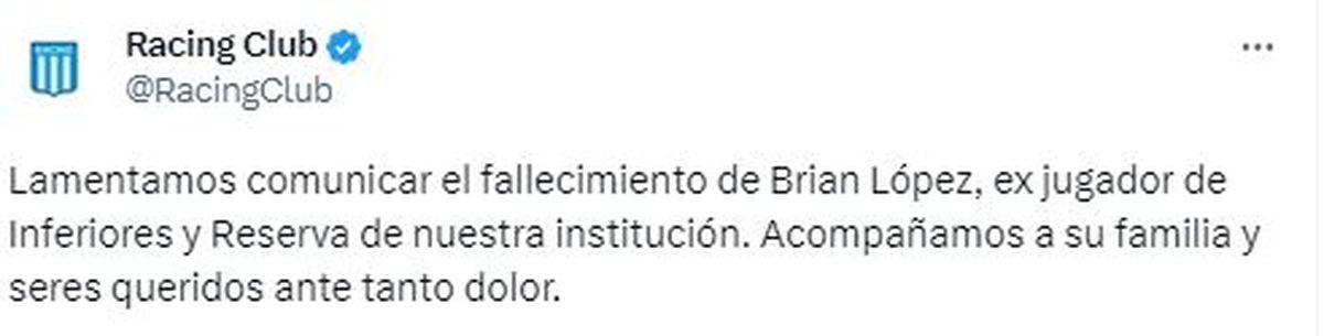 La institución de Avellaneda también expresó sus condolencias a través de su cuenta oficial de Twitter: “Lamentamos comunicar el fallecimiento de Brian López, ex jugador de Inferiores y Reserva de nuestra institución. Acompañamos a su familia y seres queridos ante tanto dolor”.