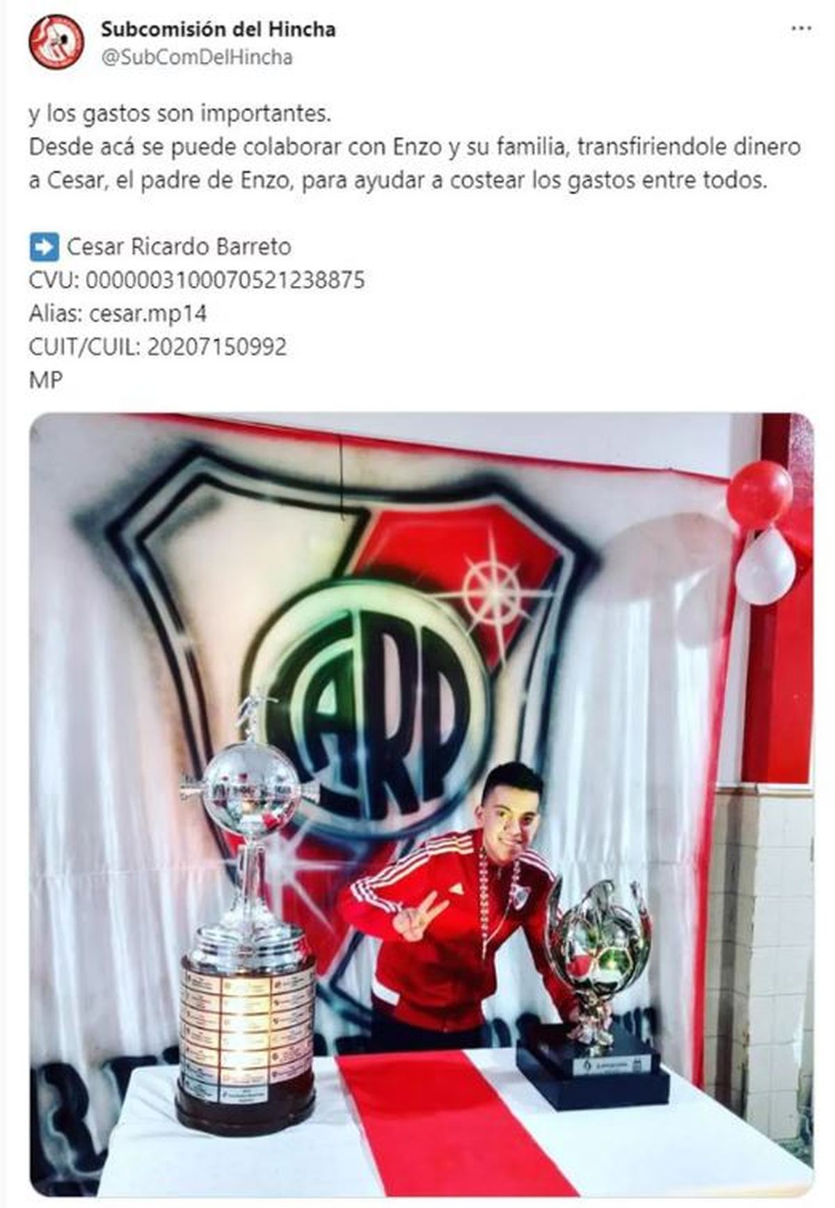 Otra hincha del Millonario, Yammila, compartió en sus redes sociales los detalles de la cuenta bancaria que la familia de Enzo abrió para recibir apoyo financiero. Además, expresó su agradecimiento hacia Jorge Brito y Antonio Caselli por intervenir en la organización del viaje urgente de los padres de Enzo a Porto Alegre.