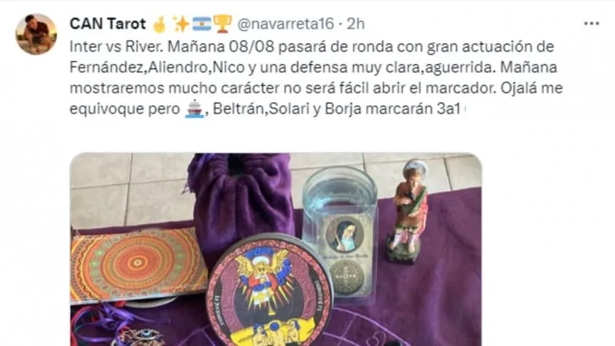 En relación a este enfrentamiento, el tarotista de River, conocido por prever los resultados del equipo, compartió sus opiniones a través de su cuenta de Twitter. En sus pronósticos, afirmó que el Millonario avanzará a los cuartos de final con una actuación destacada de jugadores clave como Fernández, Aliendro y Nico (De la Cruz), respaldados por una defensa sólida y tenaz.