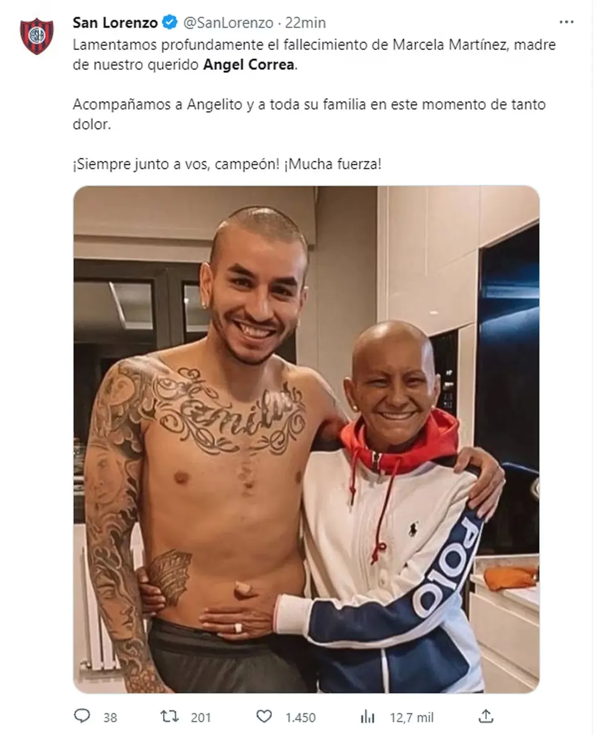 “Lamentamos profundamente el fallecimiento de Marcela Martínez, madre de nuestro querido Ángel Correa. Acompañamos a Angelito y a toda su familia en este momento de tanto dolor. ¡Siempre junto a vos, campeón! ¡Mucha fuerza!”, escribió el Ciclón en sus redes.