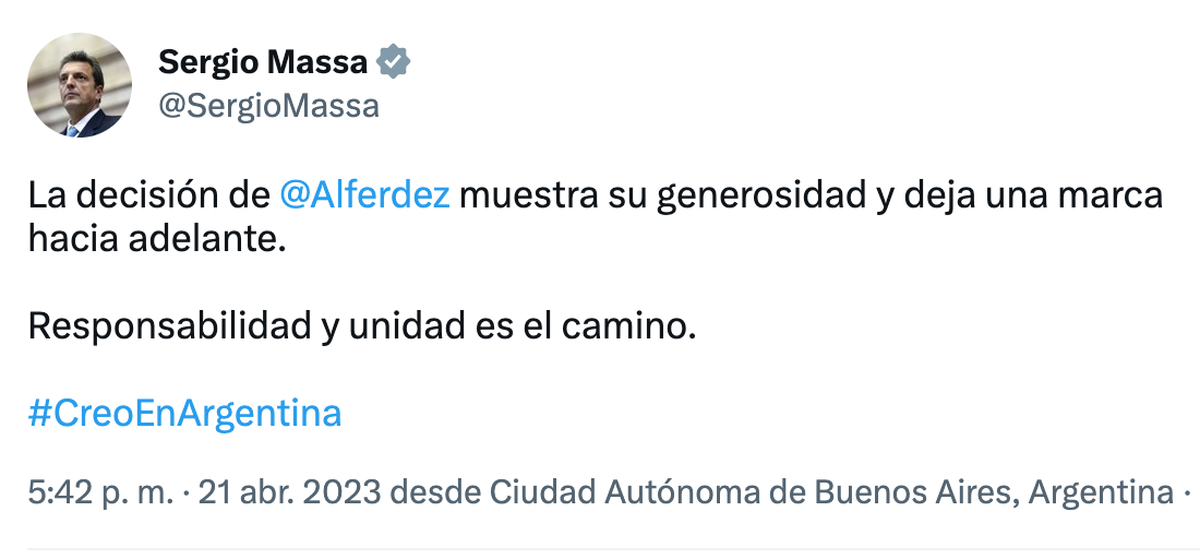 "La decisión de Alberto Fernández muestra su generosidad y deja una marca hacia adelante. Responsabilidad y unidad es el camino", señaló Massa en su tuit, que se cierra con la frase "Creo en Argentina".
