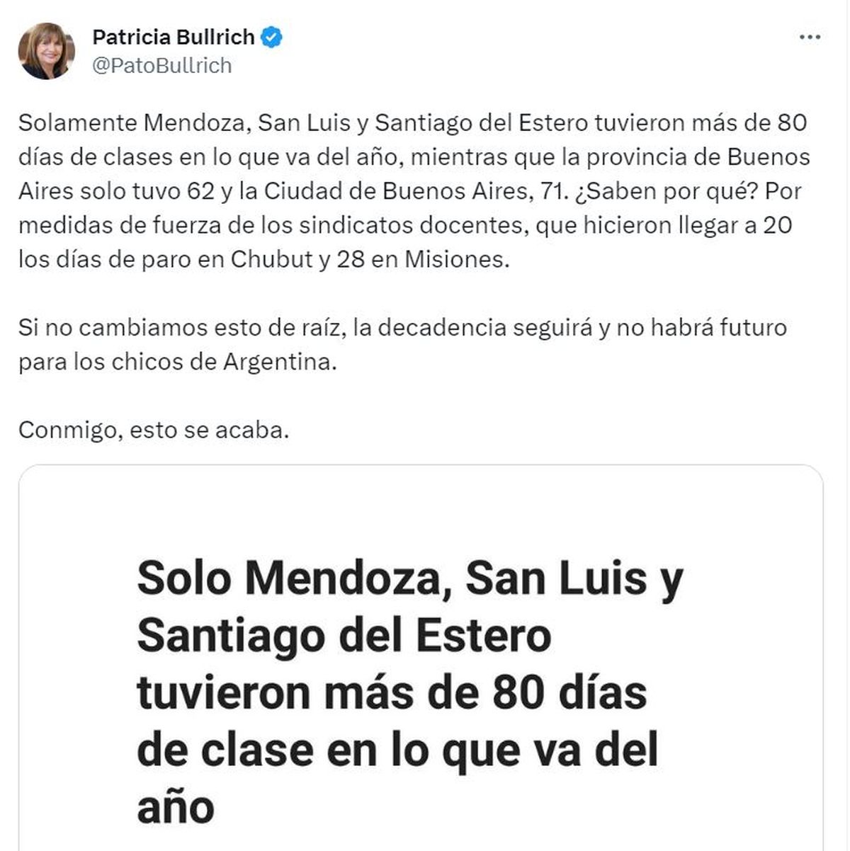 Soledad Acuña, ministra de Educación de la Ciudad de Buenos Aires, respondió a las declaraciones de Patricia Bullrich, precandidata a presidente y rival de Horacio Rodríguez Larreta en la interna de Juntos por el Cambio. Bullrich afirmó que en la Ciudad de Buenos Aires hubo menos de 80 días de clases en lo que va del año. Ante esto, la funcionaria porteña acusó a la exministra de Seguridad de caer en una estrategia que implica herir al otro y enfatizó la importancia de mostrar los logros y acciones de cada gestión en lugar de atacar.