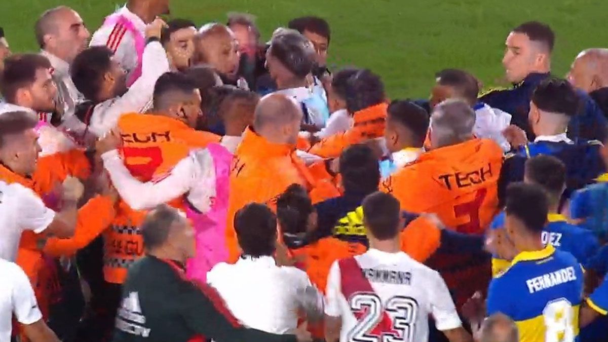 El partido estuvo detenido varios minutos y, tras la revisión del VAR, el árbitro Darío Herrera decidió expulsar a Miguel Merentiel, Nicolás Valentini, Ezequiel Fernández y Jorge Almirón, por el lado de Boca, y a Agustín Palavecino, Ezequiel Centurión y Elías Gómez, por el lado de River.