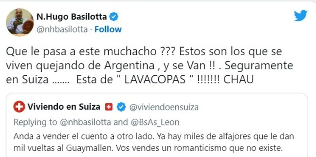 Más tarde, Basilotta exclamó: “Que le pasa a este muchacho ??? Estos son los que se viven quejando de Argentina , y se Van !! . Seguramente en Suiza ....... Esta de " LAVACOPAS " !!!!!!! CHAU”.