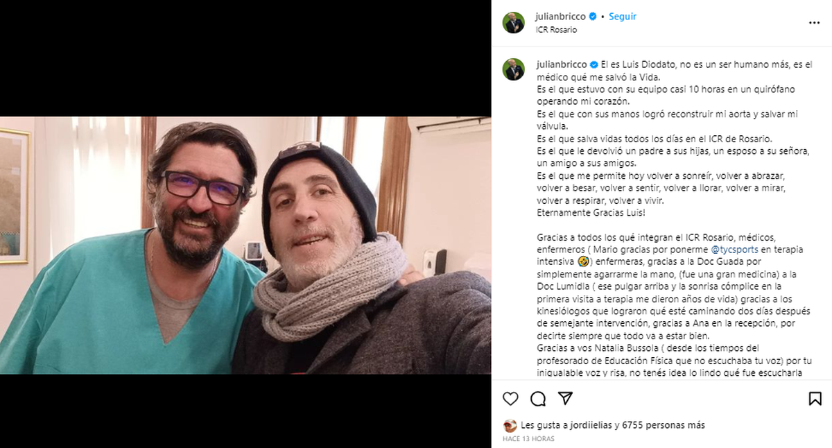 Además de poner el foco de su agradecimiento en la persona que lo operó del corazón, Bricco también detalló todas las personas que lo asistieron en su internación. “Gracias a todos los qué integran el ICR Rosario, médicos, enfermeros (Mario, gracias por ponerme TyC Sports en terapia intensiva) enfermeras; gracias a la doc Guada por simplemente agarrarme la mano (fue una gran medicina); a la doc Lumidla (ese pulgar arriba y la sonrisa cómplice en la primera visita a terapia me dieron años de vida); gracias a los kinesiólogos que lograron que esté caminando dos días después de semejante intervención; gracias a Ana, en la recepción, por decirte siempre que todo va a estar bien”.